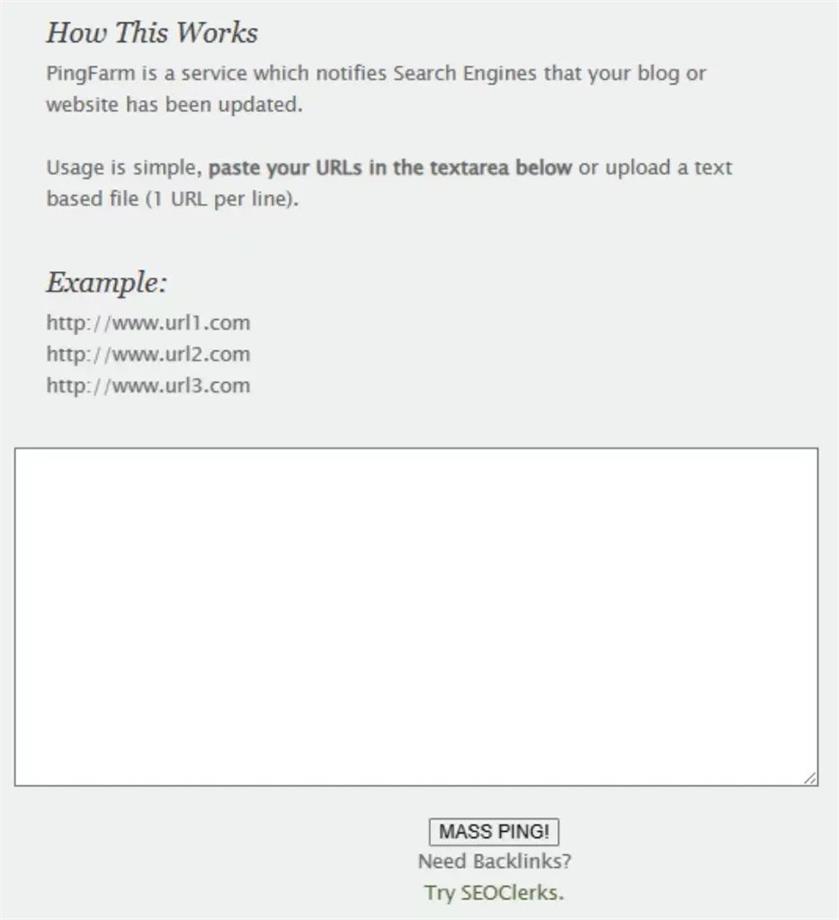 Pingfarm使用ping链接的方式,告诉谷歌和其他搜索引擎这是最新增加的网页或者这个网页有最新的变动,以此增加收录率。